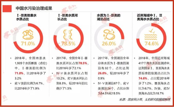 (1)水污染治理是中國環保行業最大的細分領域之一,資金投入多,中國地表水、河流、湖泊、近岸海域水質因此持續改善。2018年,全國全年Ⅰ-Ⅲ類地表水水質占比為71.0%。2017年,全國全年Ⅰ-Ⅲ類水質河長占比為78.5%,全國全年水質為Ⅰ-Ⅲ類的湖泊有32個,占比達到26.0%。2018年,達到國家Ⅰ、Ⅱ類海水水質標準的近岸海域海水水質監測點占比達到74.6%,中國地表水、河流、湖泊、近岸海域的優質水質占比較往年均有所提升。