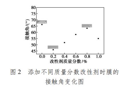 由圖 2 可以看出,當(dāng)不添加共混改性劑時,接觸角最大,說明單純的 PES 膜是疏水性比較強(qiáng)的膜,因?yàn)?/span> PES 含有0.jpg基團(tuán),所以表現(xiàn)出疏水性。