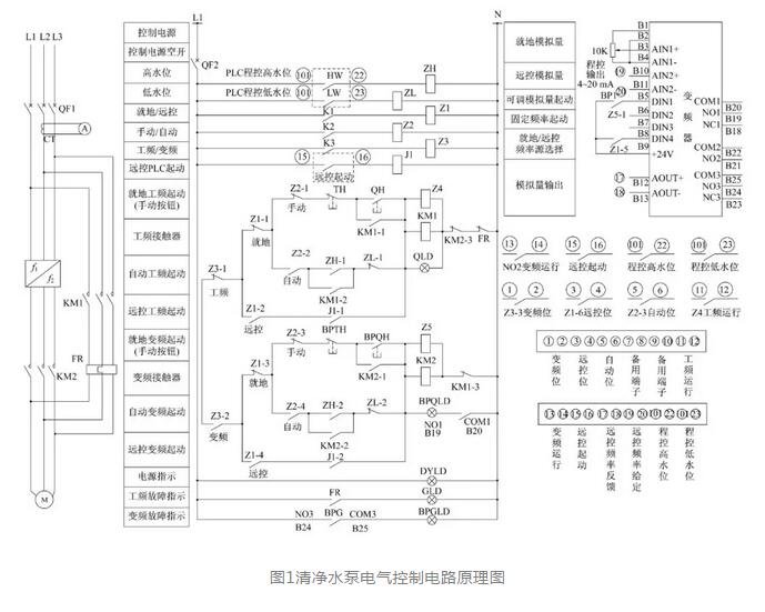 (6)清凈水泵本體擴(kuò)容改進(jìn),配套電動(dòng)機(jī)功率由15kW升至75kW。4設(shè)備改進(jìn)后的電氣控制原理改進(jìn)后的清凈水泵電氣控制電路實(shí)現(xiàn)如下功能:在遠(yuǎn)方控制方式下,可從PLC程控畫面工頻起動(dòng)和變頻起動(dòng)水泵;在自動(dòng)操作形式下水處理設(shè)備,水泵的起停受水池高、低液位自動(dòng)控制,水池液位達(dá)到高水位定值(3m)時(shí),PLC程控高水位接點(diǎn)閉合自動(dòng)起動(dòng)水泵,水池液位降至低水位定值(1.5m)后,程控低水位接點(diǎn)閉合自動(dòng)停運(yùn)水泵;在變頻運(yùn)行模式下,可從水泵就地控制柜和PLC程控畫面調(diào)節(jié)變頻器輸出頻率。