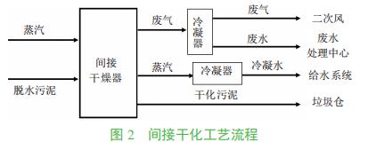 間接加熱式又稱熱傳導(dǎo)干燥技術(shù),工藝流程見圖 2。在干燥過(guò)程中,熱介質(zhì) (蒸汽、導(dǎo)熱油等)并不直接與污泥接觸,而是通過(guò)熱交換器將熱能傳遞給濕污泥,使污泥中的水分蒸發(fā)。在整個(gè)干化過(guò)程中,熱介質(zhì)與污泥分離,完成傳熱后冷凝回收,進(jìn)入焚燒廠給水系統(tǒng);廢氣經(jīng)冷凝后產(chǎn)生的廢水送入廢水處理中心處理;其余廢氣可作為二次風(fēng)送入焚燒爐;完成干化的污泥焚燒或填埋。