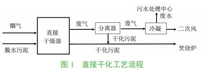 直接加熱又稱對(duì)流熱干燥技術(shù),工藝流程見圖 1。在污泥干化的過(guò)程中,熱介質(zhì) (一般為煙氣) 與污泥直接接觸并低速流過(guò)污泥,向污泥層傳遞熱量,使污泥中的水分蒸發(fā),并將蒸發(fā)的水分帶走。隨著污泥含水率的降低,污泥將產(chǎn)生一定的粉塵并飄入廢氣中。廢氣一般先經(jīng)過(guò)分離器,將部分干化的污泥分離,剩余的廢氣冷凝后送入焚燒廠二次風(fēng),廢水送入廢水處理中心。